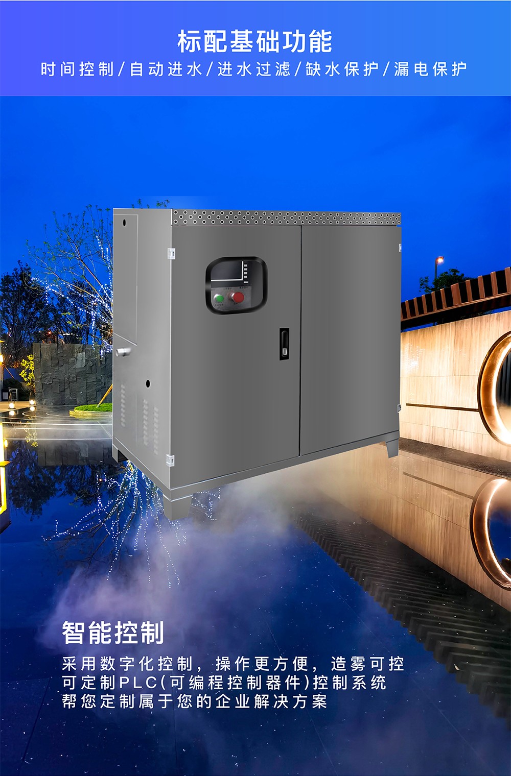景程雾森人造雾景观设备,自主生产研发,厂家销售,质量可靠。主机自带各种安全配置,保证设备24小时平稳运行。采用德国ABB/ SIEMENS三相异步电动机、意大利 NTERPUMP/HAWK/AR高压柱塞泵作为主机械核心部件,采用法国 Schneider品牌,作为设备电子元器件部件,部件双重绝缘且充分耐热具有阻燃性,产品性能更稳定、机械噪音很小很平缓、质量更好。