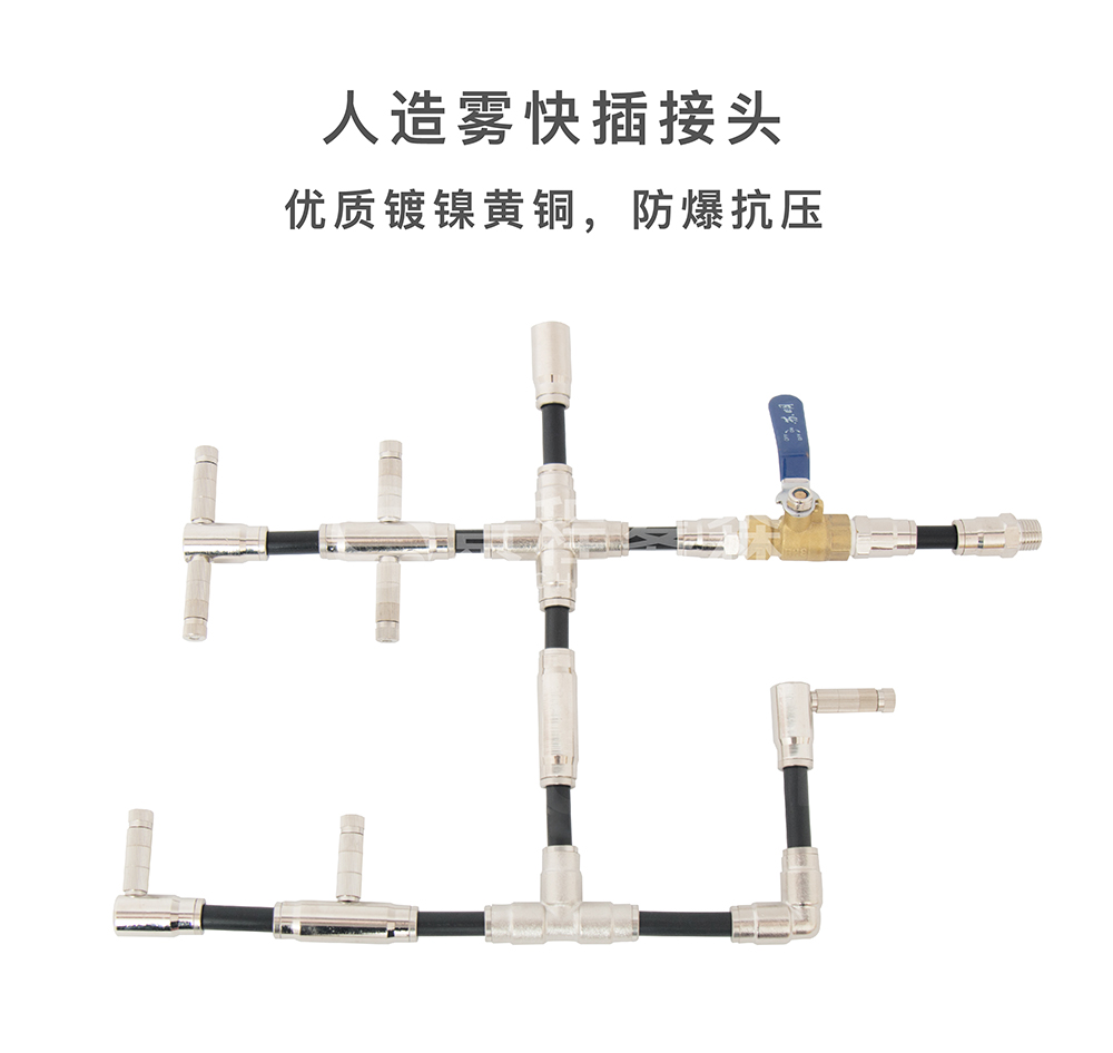 适用于高压PE管,操作方便省时省力,适用于高压PE管,操作便捷节省成本,快插式连接件是人工造雾行业常见的安裝方式之一,其特点就在于安裝便捷,节约人工,节约材料成本费用。但是压力不建议调节过高,基本上40-70KG就可达到效果。快插式连接件均连接软管,适用于异形场地,便捷贴合现有异形景观做隐藏。